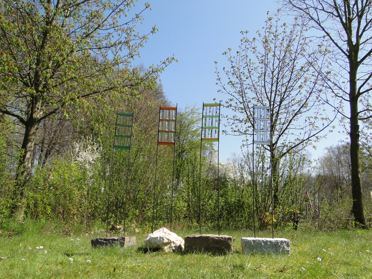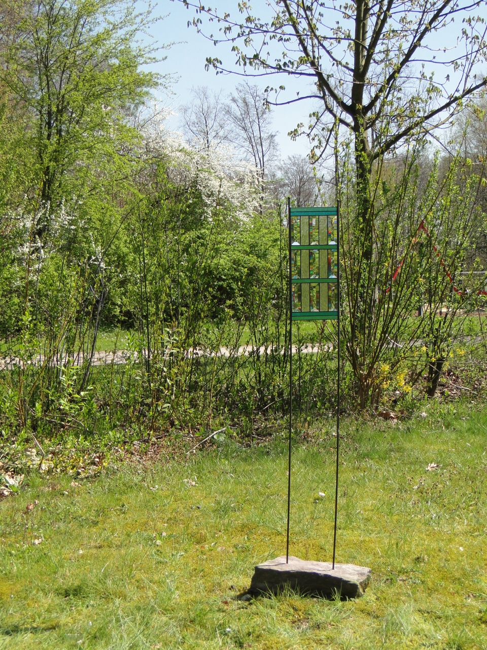 Das ganz Besondere an dieser Stele sind die mitverarbeiteten Glasfacetten ( im Glashandel auch Bevels genannt ). Wenn Sie durch die Stele hindurchschauen, stellen die Facetten das Bild etwas verzerrt da - so wieman das bei alten Fenstern schon mal beobachten kann.
